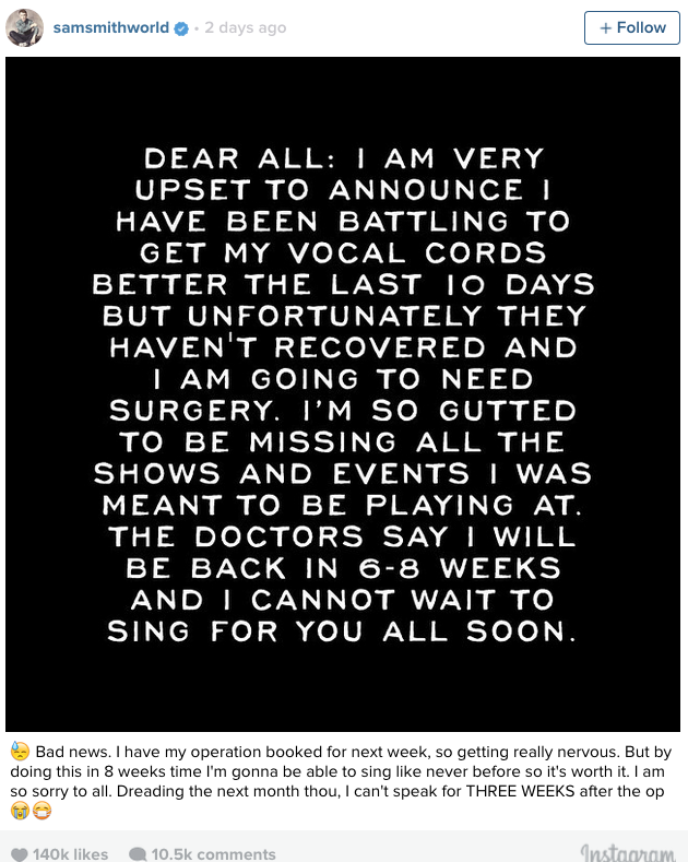 Sam Smith sembla que vulgui tenir una vida paral·lela amb la també britànica Adele, i ara ha anunciat que els seus problemes a les cordes vocals, que el van obligar a cancel·lar alguns concerts, necessitaran resoldre’s amb cirurgia.