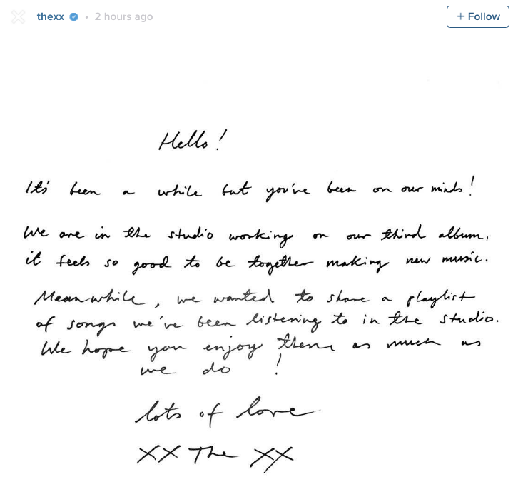 The xx han confirmat que es troben a l’estudi de gravació, preparant el relleu de Coexist, editat el 2012. Des de llavors, hem pogut gaudir del treball en solitari de Jamie xx, In colour.