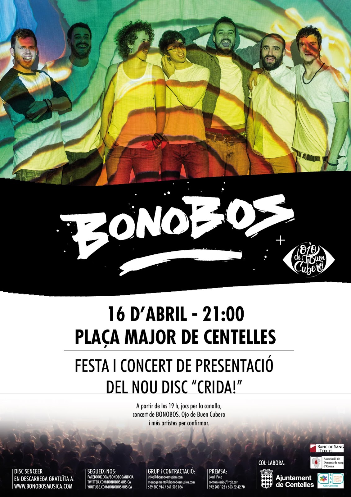 Gratuït, popular, compromès i festiu. Així serà el concert de presentació de “CRIDA!”, 2n disc de la banda de Centelles BONOBOS que ha decidit realitzar el 16 d’Abril el primer assalt de la gira de presentació del seu nou treball a la Plaça Major del seu poble i convidant a tots els seus seguidors d’arreu de Catalunya a la seva població d’orígen perquè, com diuen ells, “tot ha de tornar a casa algun dia, per poder-ho compartir amb els teus, i hem volgut que fos aquest”. Cal recordar que Bonobos, amb el seu primer disc “Animalànima” (RGB Suports, 2014) va esdevenir Premi Enderrock a Artista Revelació del 2014 escollit pel públic.