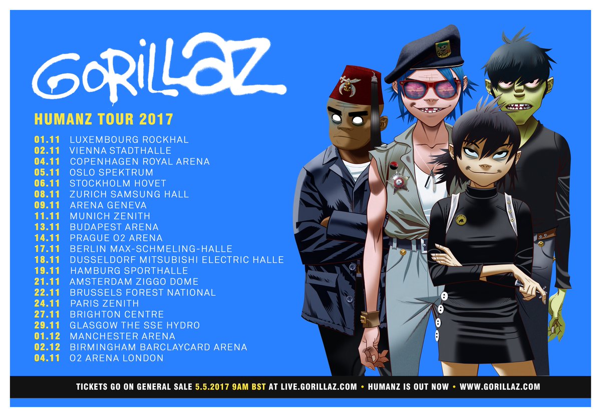 Una setmana després de publicar el seu nou disc Humanz, Gorillaz han donat a conèixer les dates de la seva gira europea, que passarà per un bon grapat de països, entre ells Alemanya, França, Bèlgica, Regne Unit o Àustria entre altres. De moment no hi ha cap data al nostre país.
