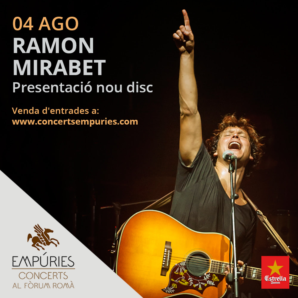 Ramon Mirabet presentarà les cançons del seu tercer disc al Fòrum Romà d’Empúries – L’Escala el dia 4 d’agost. La seva veu trencada, amb matisos que dibuixen un univers forjat per molts quilòmetres de vivències i la seva energia, fan que ningú es vulgui perdre els seus directes. Les seves cançons beuen d’una experiència personal que ha convertit la vida de Ramon Mirabet en tota una aventura. Sens dubte un dels artistes més destacats del panorama musical actual, i que segueix acumulant èxits any rere any.