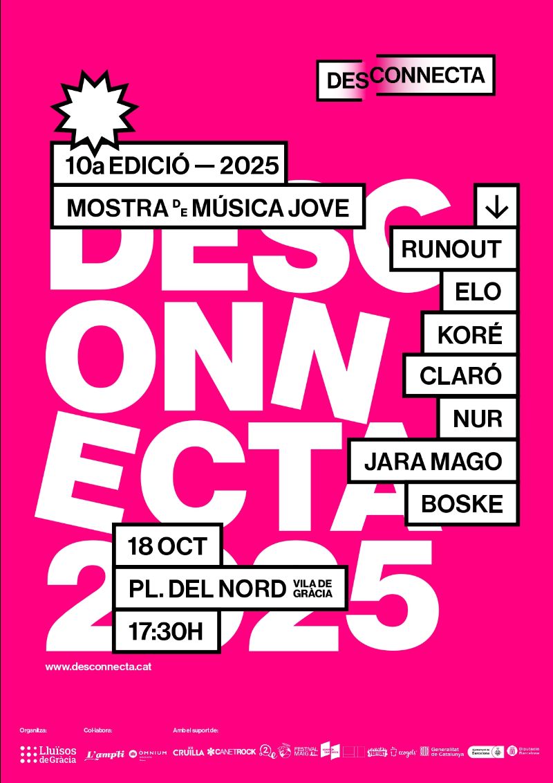 El Desconnecta, la mostra de música jove organitzada pels Lluïsos de Gràcia, L’Ampli i Òmnium Gràcia, arriba enguany a la seva desena edició. El festival tindrà lloc el 18 d’octubre a la plaça del Nord, amb un cartell de set bandes emergents escollides d’entre més de 50 propostes: Runout, Elo, Koré, Boske, Jara Mago, Nur i Claró.