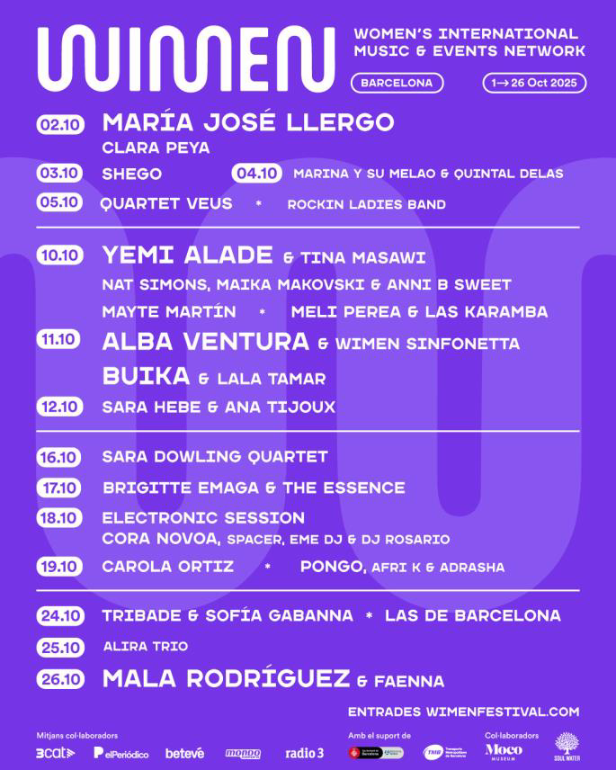 El WIMEN Festival dona el tret de sortida a Barcelona amb un cartell de luxe encapçalat per Clara Peya i María José Llergo, dues de les veus més potents de l’escena actual. Elles obriran un mes de concerts i activitats on també brillaran noms com Mala Rodríguez, Buika, Ana Tijoux, Yemi Alade, Mayte Martín, Shego, Tribade o Sofía Gabanna.