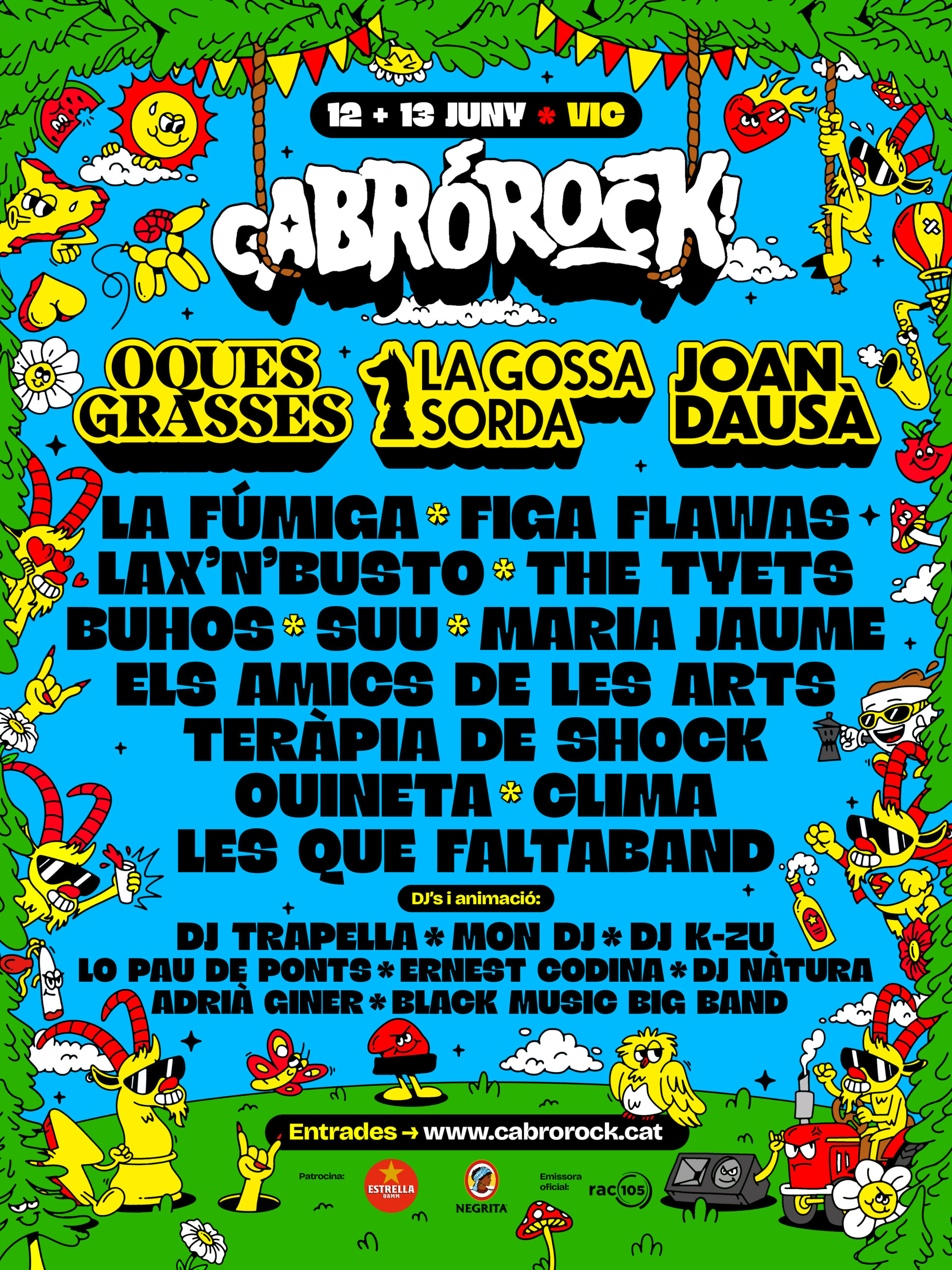 El cartell, que ja apuntava alt amb noms com Oques Grasses, La Gossa Sorda, Joan Dausà, La Fúmiga o Els Amics de les Arts, creix encara més amb la incorporació d’artistes de primer nivell com Figa Flawas, Lax ‘n’ Busto, The Tyets, Buhos, Suu, Teràpia de Shock, Clima, Maria Jaume, Ouineta o Les Que Faltaband, a més de DJs i propostes com Trapella, Mon DJ, Lo Pau de Ponts, Ernest Codina, DJ Nàtura o Adrià Giner.