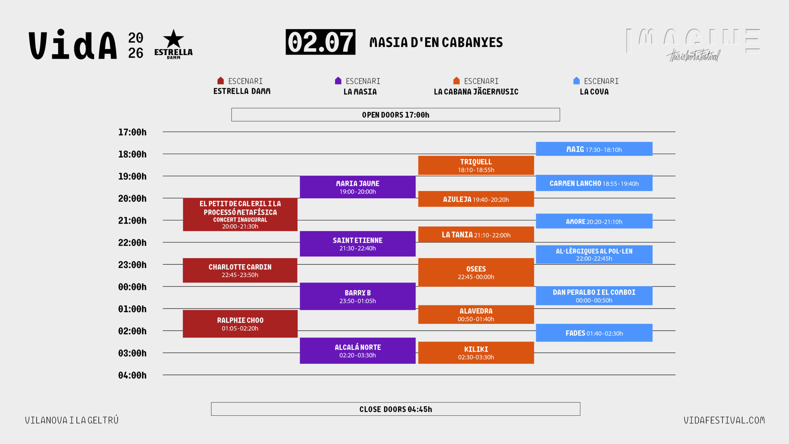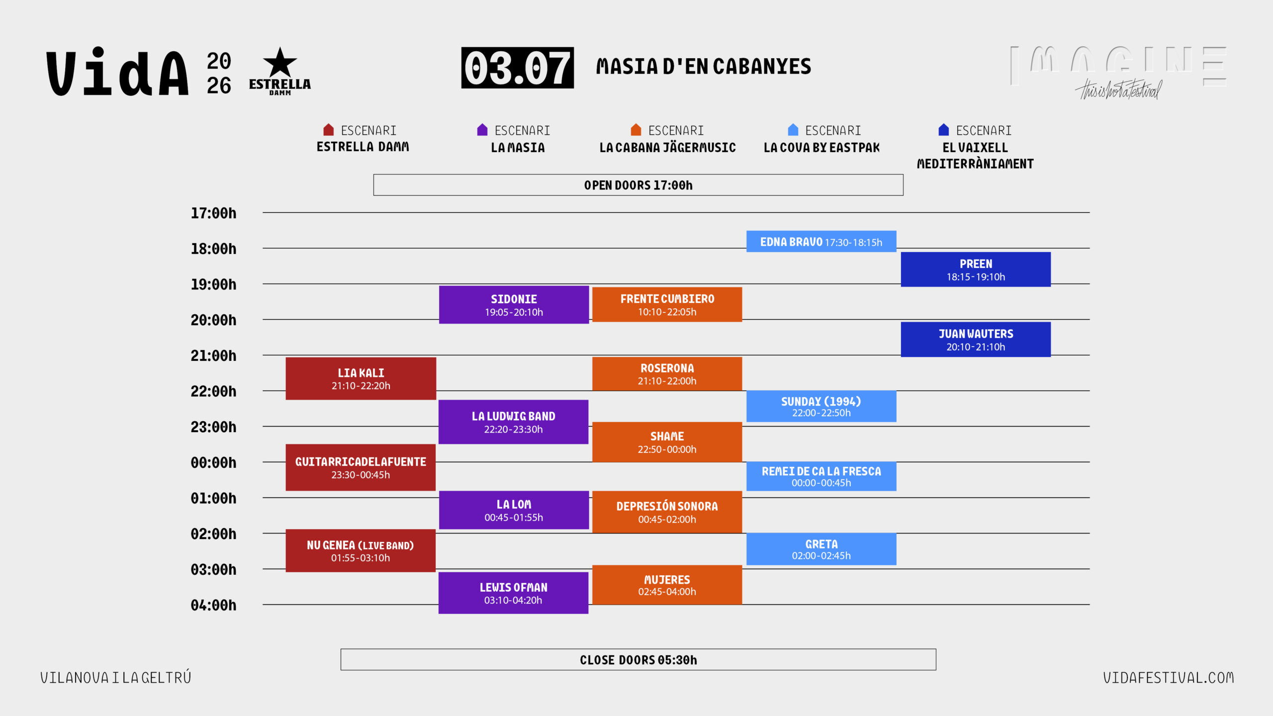 A més, el festival mantindrà la seva proposta nocturna amb el Vida Club, que allargarà la música fins a la matinada amb sessions de DJs com Myd, Yung Prado o Cassius, reforçant l’experiència global del recinte.