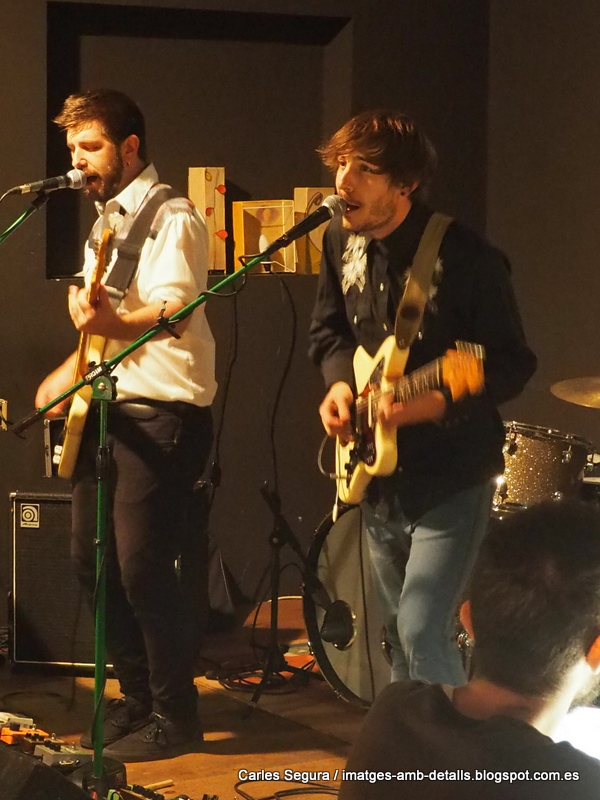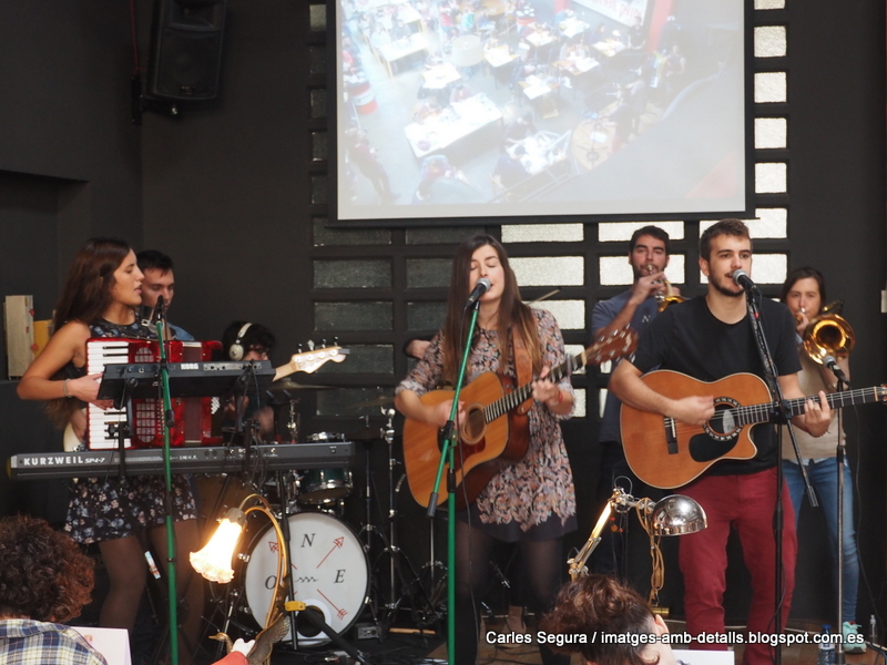 Els següents en actuar, són Sense Sal i no puc deixar de pensar que, amb un escenari tant reduït, igual tenen problemes situar-se. Les proves de so, s’escolten genial i per fi, comença l’actuació. El ritme i l’energia de les seves cançons semblen passejar-se de fulla en fulla, entre els llàpissos i els pinzells i ens fan recordar Algun lloc al món (Autoeditat). Cada vegada hi ha més gent i com ens han avisat que, la zona dels il·lustradors, tot i estar delimitada, està oberta a tothom perquè, en petits grups de 4 o 5 persones, puguin veure de prop les obres dels dibuixants, la gent es passeja entre les taules observant els il·lustradors. Tothom canta amb ells i quasi, sense adornar-nos, el concert arriba al final. Tot i que vaig estar al Tradicionarius, a l’estrena del disc, he de reconèixer que avui m’han agradat molt més tenir-los tan a prop i especialment perquè per fi he aconseguit trencar el món virtual amb l’Alicia.